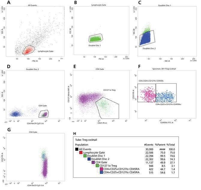 The BD FACSAriaII system was set up for a sort using either a 70-μm or 100-μm nozzle (70 psi or 35 psi with a frequency of 87 or 60 kHz respectively). CD45RA+ Tregs and CD45RA- Tregs were sorted in purity mode at a rate of 10,000 to 11,000 events per second.