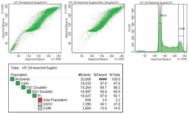 Human HT-29 colon cancer cells were stained with Hoechst 33342 and acquired on the BD FACSAriaIII equipped with a 375-nm laser (left dot plot). As a control, side population expression was blocked (right dot plot).